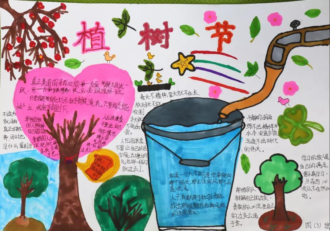 每一张手抄报皆是全班同学智慧的结晶,他们以植树节活动为切入点,把“植树、护树、爱绿”的生态文明观念融入在每一幅画与字里行间之中。